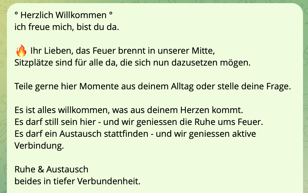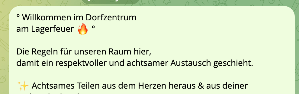 Der Raum des Austausches, wo es auch immer Platz für deine Fragen hat, findest du auf Telegram. Es ist eine geschlossene Gruppe, in welcher du drei Abteilungen findest:
